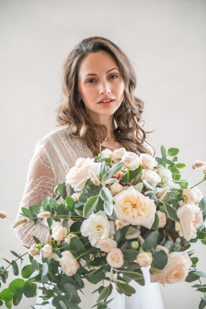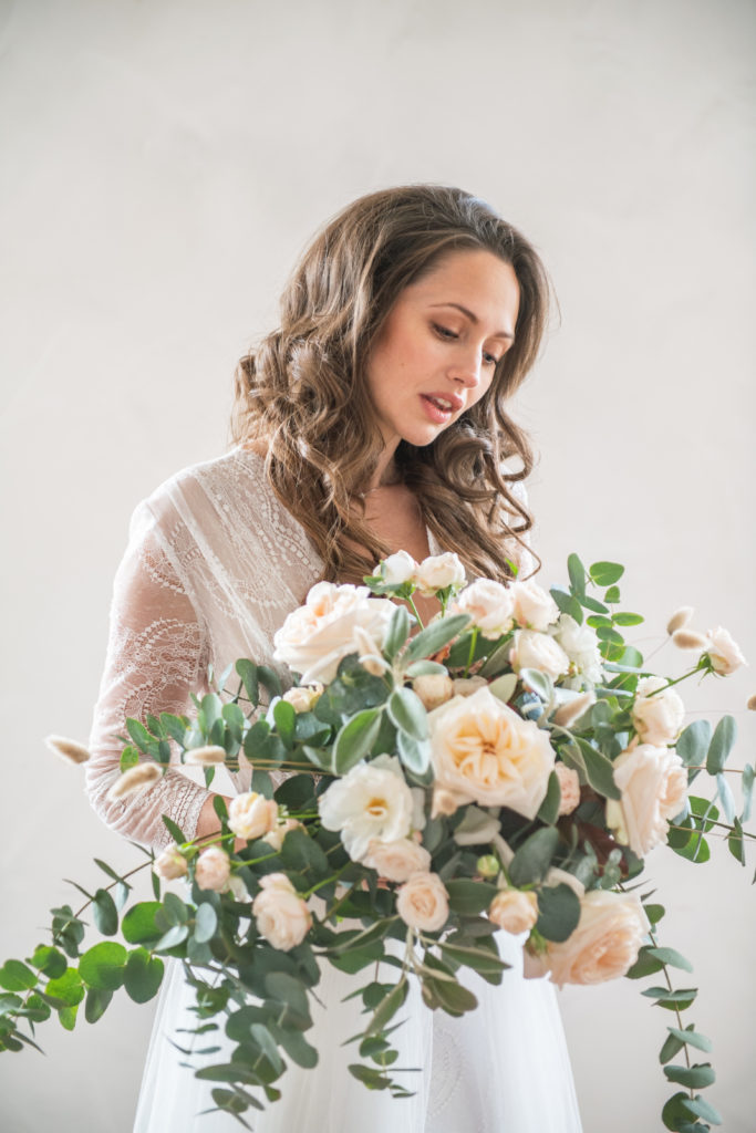 Laura portait une robe de mariée conçue par Aude Violette Création, qu’accompagnait un élégant bouquet de roses couleur pêche, dans les tons pastels.