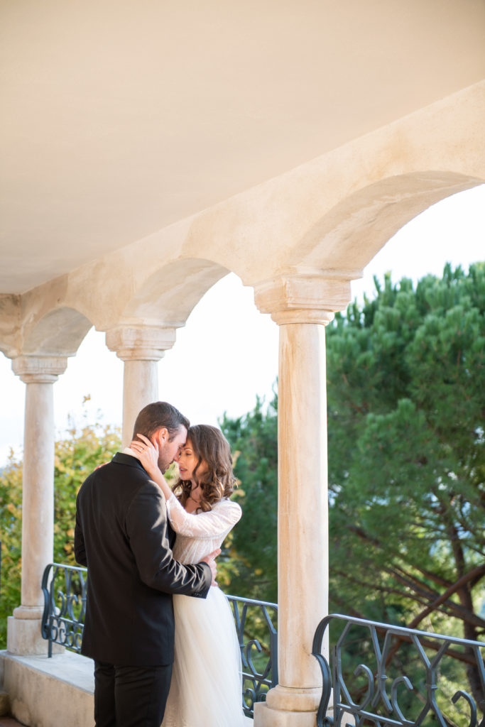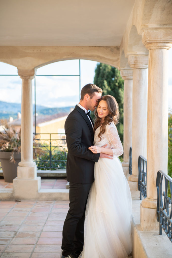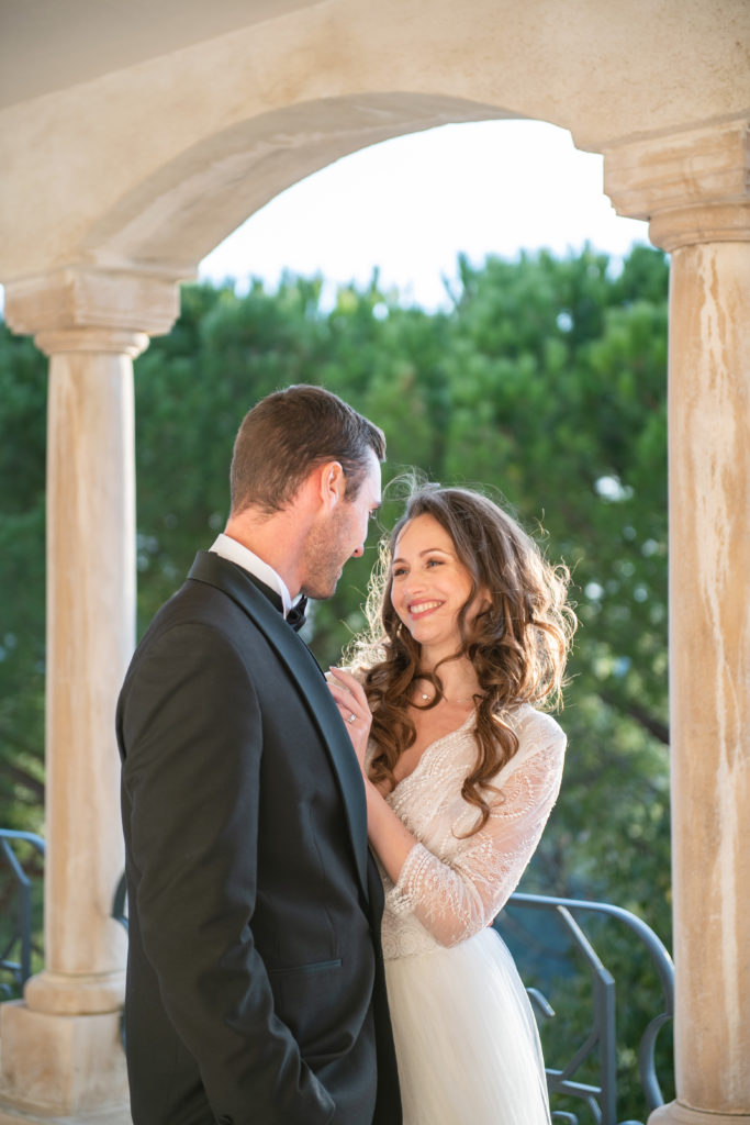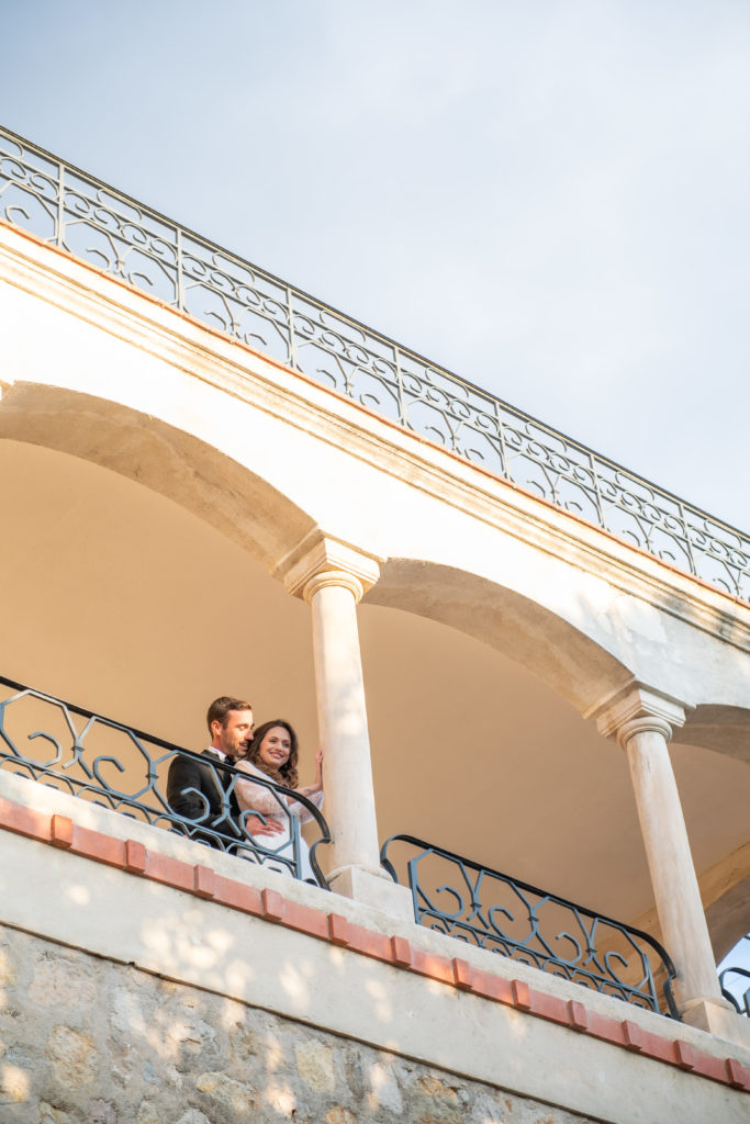 La séance photo avec les mariés a eu lieu en fin d’après-midi, dans la lumière rasante du soir. Cette lumière si belle et si particulière, que les anglais appellent golden hour (l’heure dorée), est particulièrement féérique en Provence. Tout autour de nous se nappait d’une lumière dorée. La marié a rejoint la mariée sur le balcon. Puis, réunis sous l’arche, nos deux modèles baignaient dans cette lumière presque irréelle.