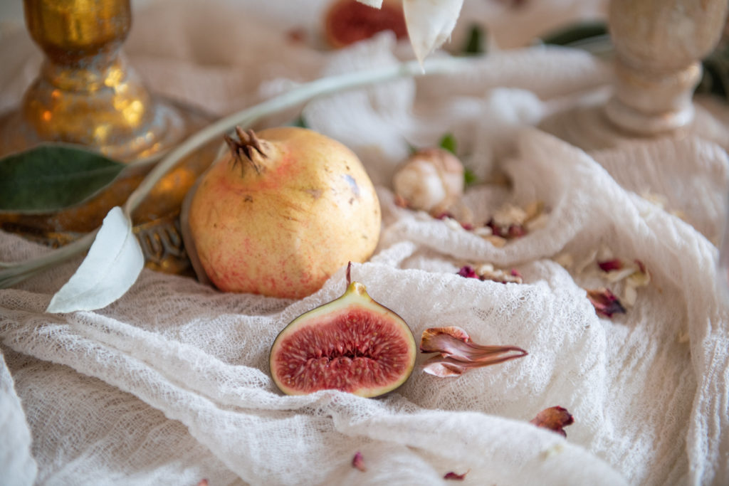 La décoration des tables était également d’inspiration fine art, avec des tons pastels, des assiettes ocres et cuivrées, des roses pâles, la nappe bleue. Le wedding cake était également dans ces tonalités de blanc et rose, le chef pâtissier de l’Atelier by Max y ayant mis à l’honneur des fruits méditerranéens, comme la figue et la grenade.