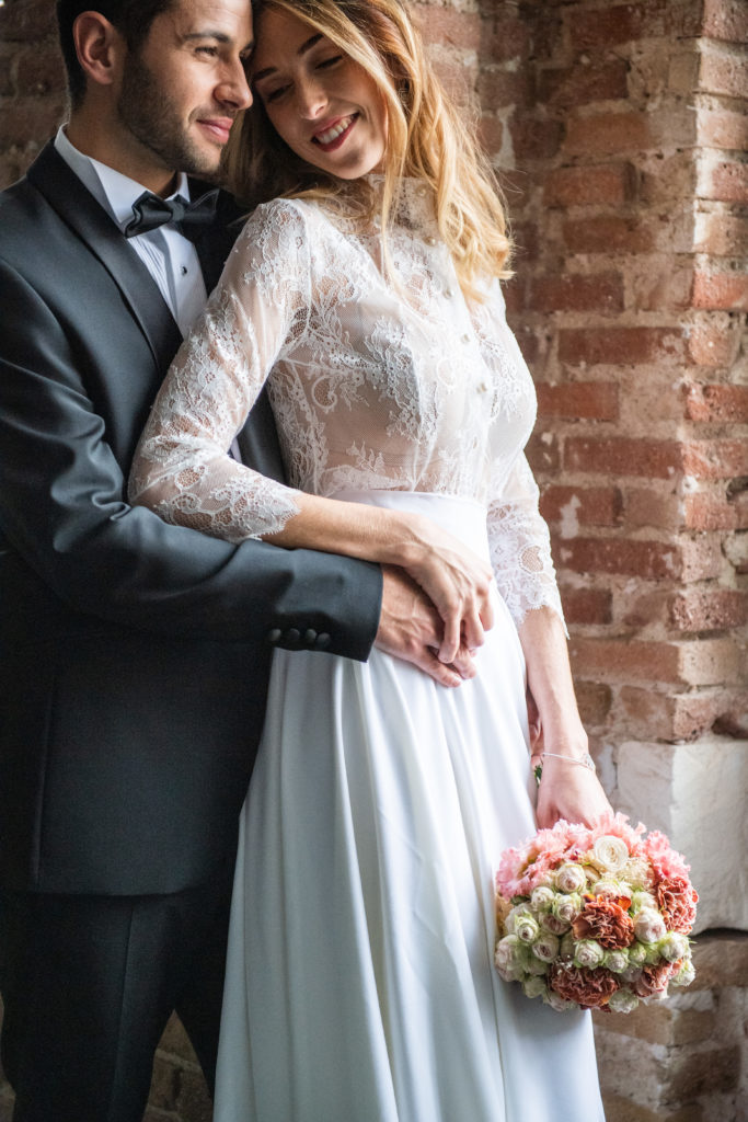 Nous avons réalisé ce shooting photo mariage avec un vrai couple et avec les codes du fine art. Maud porte une robe de mariée en dentelle très élégante avec un bouquet champêtre aux couleurs qui rappellent les briques du Télégraphe de Toulon. Kévin le marié est en smoking sobre et élégant.